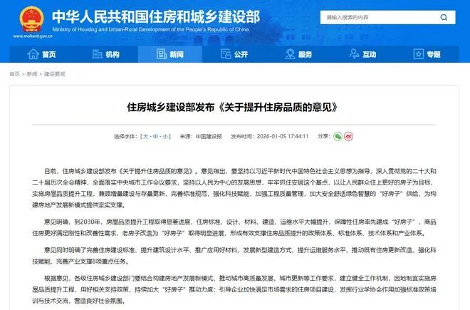 住建部在2025年12月首次系統(tǒng)提出“好房子”建設(shè)標(biāo)準(zhǔn),并明確2026年起在全國(guó)推行。