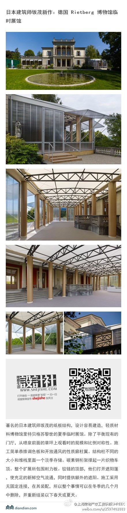 @上海房地產總工俱樂部SHREEC:綠色建筑 日本建筑師坂茂新作:德國 Rietberg 博物館:紙板結構,除了平衡現(xiàn)有的門廳,從噴泉前面的草坪上觀看時的規(guī)模和比例對稱性。施工簡單恭維調色板和開放通風的性質廊柱翼。結構柱不同的大小和堆棧里面一個淡季存儲。碳素鋼桁架撐起一片織物車o。整個擴展所包圍耐力板。
