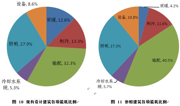 動態(tài)能耗模擬軟件的模擬分析,項目全年計算能耗為181.5噸標準煤,其中空調(diào)系統(tǒng)能耗為112.4噸標準煤,照明系統(tǒng)能耗為49.5噸標準煤,主要房間設備總能耗為19.6噸標準煤,大樓的年單位面積能耗為15.4千克標準煤/年。相對于參照建筑能耗,整體節(jié)能率達到20.2%。現(xiàn)有設計建筑和參照建筑的能耗構(gòu)成比例見圖10和圖11。