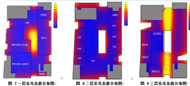 大樓充分利用了自然采光,在屋頂中部設置一s大面積自然采光中庭,采光天窗面積334平方米,配合大面積的玻璃幕墻,最大限度地引入自然光,增大了各樓層自然光的采光面積,同時為建筑使用者提供了舒適的工作與休息環(huán)境。通過Ecotect軟件進行的采光模擬可以看出(見圖7、圖8和圖9),采光系數(shù)大于2%的區(qū)域面積為3747.7平方米,整個建筑的自然采光系數(shù)達到88.7%,滿足北京市《綠色建筑評價標準》的要求。在大樓地下一層連通1#樓的地下通道屋頂上,沿通道行走方向設計了一個大面積條形屋頂天窗,全陰天工況下,連廊的采光系數(shù)能達到1%以上,起到了引導作用,并為地下一層創(chuàng)造了自然的氛圍。