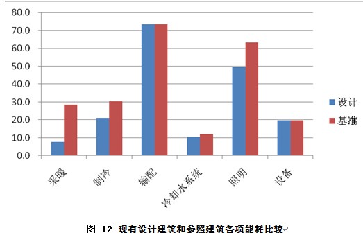 從圖12我們可以看出,現(xiàn)有設i的各分項能耗與基準建筑相比,均有不同程度的降低。其中,由于設計建筑空調(diào)冷熱源為地源熱泵系統(tǒng),制冷COP為5.3,性能系數(shù)相比基準建筑COP為4.1的地源熱泵冷源有了一定的提高,采暖COP為4.5,性能系數(shù)相比基準建筑效率為0.86的燃氣鍋爐熱源有了大幅提高,同時設置了熱回收裝i,因此采暖系統(tǒng)的節(jié)能貢獻率最大,達到45.8%。