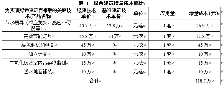 該綠色建筑的增量成本主要由節(jié)能節(jié)水的技術(shù)應用,室內(nèi)舒適環(huán)境的創(chuàng)造,以及高效運營的系統(tǒng)搭建等方面構(gòu)成。在節(jié)能技術(shù)上,項目主要采用了地源熱泵機組,二氧化碳以及室內(nèi)污染物艱澀設備,以及智能遮陽系統(tǒng)、智能排風系統(tǒng)的結(jié)合,同時大樓采用了高能效e的制冷主機;在節(jié)水技術(shù)上,項目采用了高效的節(jié)水器具;大樓綠色建筑總增量成本約為118.7萬元,單位面積增量成本為101.0元/m2。