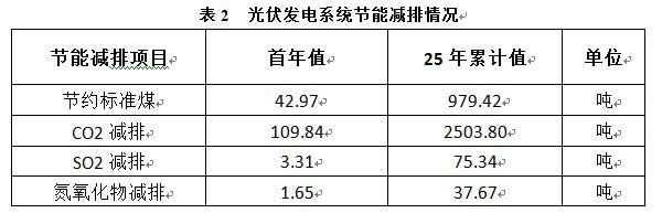 光伏發(fā)電節(jié)能分析:根據(jù)北京市太陽(yáng)能資源條件,項(xiàng)目組件全年可接受的太陽(yáng)輻射量約為1394kWh/m2,系統(tǒng)整體效率按照78%來(lái)做發(fā)電量評(píng)估,則項(xiàng)目建成后光伏電站首年發(fā)電量約130.21 MWh,25年累計(jì)發(fā)電量為2967.94MWh。光伏電站的節(jié)能效益可以用節(jié)省標(biāo)準(zhǔn)煤的數(shù)量來(lái)衡量。>常用燃煤火電機(jī)組發(fā)電,每發(fā)電1kWh需消耗標(biāo)準(zhǔn)煤約330g。光伏電站的環(huán)保效益則以溫室氣體的減排數(shù)量來(lái)衡量。具體數(shù)據(jù)見(jiàn)表2。