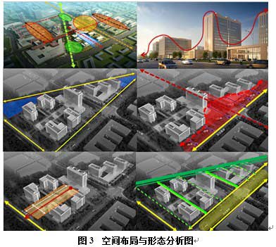 項(xiàng)目規(guī)劃與建筑布局強(qiáng)調(diào)良好的區(qū)域空間形態(tài),主次分明、錯(cuò)落有致的建筑組群構(gòu)成,并充分考慮分期建設(shè)的可行性。建筑布局既滿足特=的使用功能,形成相對(duì)靜謐的科研辦公園區(qū)內(nèi)部形態(tài),同時(shí)也考慮與周邊地塊建筑組群及整體規(guī)劃相協(xié)調(diào)。項(xiàng)目利用建筑的層次遞進(jìn)退讓、打開(kāi)場(chǎng)地口部等手段,呼應(yīng)城市景觀節(jié)點(diǎn)和景觀軸線,且提供盡可能多的景觀視角和綠化共享, 形成聯(lián)系周邊景觀的路口空間節(jié)點(diǎn),見(jiàn)圖3。