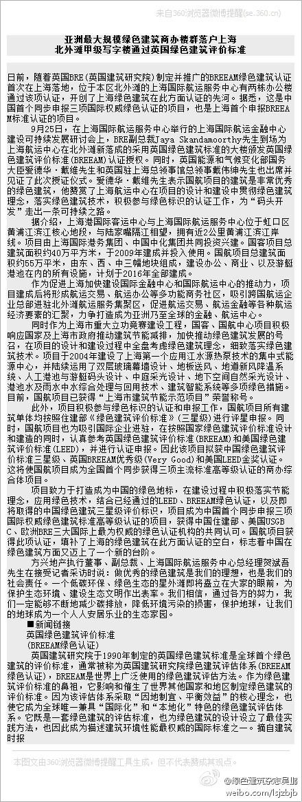 @綠色建筑雜志吳鵬:亞洲最大規(guī)模綠色建筑商辦樓群落戶上海 北外灘甲級寫字樓通過英國綠色建筑評價(jià)標(biāo)準(zhǔn) 日前,隨著英國BRE(英國建筑研究院)制定并推廣的BREEAM蛻建筑認(rèn)證首次在上海落地,位于本區(qū)北外灘的上海國際航運(yùn)服務(wù)中心有兩棟辦公樓通過該項(xiàng)認(rèn)證 ……