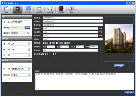 1)基本信息輸入:在綠色建筑設(shè)計(jì)軟件基本信息對(duì)話框中,錄入項(xiàng)目基本參數(shù):項(xiàng)目名稱、建筑類型、建筑面積、地理位置、建設(shè)單位、評(píng)價(jià)標(biāo)準(zhǔn)、項(xiàng)目概述等。其中,基本參數(shù)如建筑面積、用地面積、建筑戶數(shù)以及是否空調(diào)采暖等輸入信息,軟件自動(dòng)記錄,將會(huì)和之后的條文評(píng)價(jià)中涉及到的上述指標(biāo)進(jìn)行聯(lián)動(dòng),免去設(shè)計(jì)師重復(fù)輸入的麻煩。