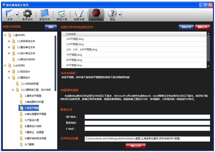 綠色建筑評(píng)價(jià)標(biāo)識(shí)工作流程包括申報(bào)單位簽署申報(bào)聲明、提交申報(bào)材料、評(píng)審組進(jìn)行形式審查、專業(yè)評(píng)價(jià)、專家評(píng)審以及公示、公布等程序。在完成本項(xiàng)目的各專項(xiàng)報(bào)告以及施工圖紙審圖備案后,需進(jìn)行申報(bào)資料的整理。在綠色建筑設(shè)計(jì)軟件中加載了住房和城鄉(xiāng)建設(shè)部科技發(fā)展促進(jìn)中心綠色建筑評(píng)價(jià)標(biāo)識(shí)管理辦公室標(biāo)識(shí)評(píng)價(jià)證明材料清單及文件夾。用戶可根據(jù)左側(cè)提供的清單列表,逐一添加整理,軟件中會(huì)對(duì)每一子目錄均有文件夾說(shuō)明,提高整理效率和資料完備性。至此,本項(xiàng)目的所有申報(bào)數(shù)據(jù)及資料全部生成。