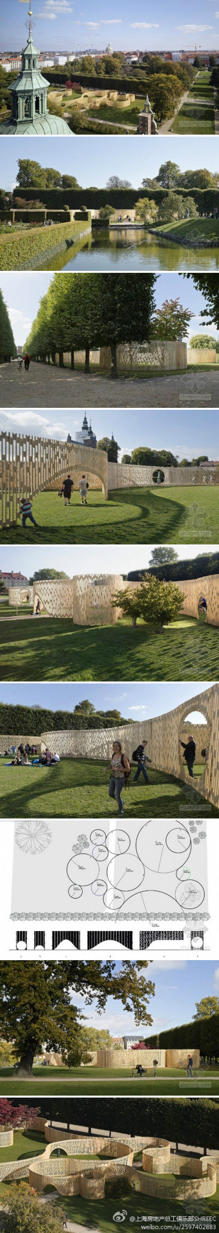 @上海房地產總工俱樂部SHREEC: 綠色建筑 FABRIC設計的丹麥皇家園林Trylletromler木亭子:T在城堡花園中只是一個臨時的裝置,由十個環(huán)形空間構成。由北歐木材抽成的板條做成的。這些部分是預制的,然后到了現場再進行安裝的。這個裝置所在的位置,在花園和城堡方向都有很好的視野,現有樹木和附近的水域也構成了十分雅致的環(huán)境。