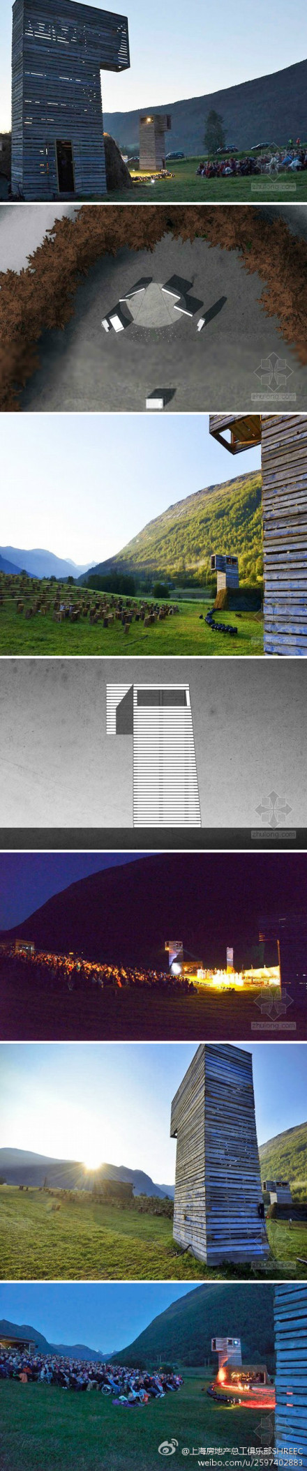 @上海房地產(chǎn)總工俱樂部SHREEC:綠色建筑 Bjornadal設(shè)計挪威海姆內(nèi)斯戶外劇場:這個美麗的建筑位于挪威海姆內(nèi)斯壯麗的群山中。舞臺的兩側(cè)設(shè)有木制塔樓,傳承了挪威景觀營造的傳統(tǒng)和民俗,使用了天然的當(dāng)?shù)夭牧稀T擁椖坷昧藞龅靥烊簧狡碌膬?yōu)勢,這些座位直接采用了天然的伐倒木,而取自當(dāng)?shù)劁從緩S的簡易樹樁更是代替了單人小凳。