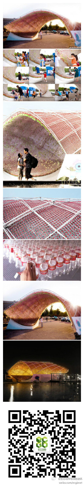 @生態(tài)城市與綠色建筑: 綠色建筑 可口可樂回收塑料瓶公共藝術(shù)裝置:由penda設(shè)計的“cola-bow”是一個公共藝術(shù)裝置,由17.000多個回收的塑料可樂瓶組成,它們被綁在一起,形成了曲線形的可口可樂logo圖案。這件作品希望能喚起公眾對塑料污染的重視,鼓勵市民將回收塑料瓶作為經(jīng)常性地環(huán)保行為來推廣。