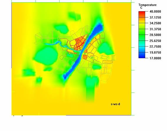 圖3 溫 度 圖Fig.3 temperature picture通過在CFD中的模擬計(jì)算,得出城市在受到一定氣候影響中的溫度、風(fēng)速、大氣壓和太陽輻射情況,通過綜合分析這些模擬計(jì)算結(jié)果,最終得出有科學(xué)依據(jù)的城市規(guī)劃布局與城市氣候之間的關(guān)系。以武漢市夏季白天為例,模擬城市在西南主導(dǎo)風(fēng)向作用下的溫度情況。通過模擬計(jì)算出的溫度圖(圖3),可以明顯看出,在夏季白天主導(dǎo)風(fēng)向情況下,武漢市熱區(qū)域分布構(gòu)成以市區(qū)為主,面積大、分布集中的多中心城市熱區(qū)域的主要特征。市區(qū)被長江、漢江分割形成三鎮(zhèn)(漢口、漢陽、武昌)四片(漢口、漢陽、武昌、青山)的多中心結(jié)構(gòu)。針對漢口主城區(qū)而言,大面積城區(qū)溫度高,武昌和漢陽城區(qū)部分地區(qū)溫度高,其它地區(qū)溫度相對較低,明顯形成了城市的“熱島效應(yīng)”。從速度圖和空氣齡圖(圖
